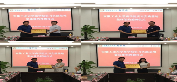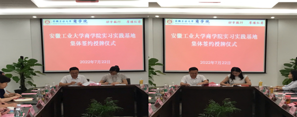 7月22日上午,商学院在秀山校区汇文楼C402会议室举行实习实践基地集体签约授牌仪式。方正证券股份有限公司马鞍山佳山路证券营业部总经理孟祥勇、东方财富证券股份有限公司马鞍山湖东北路证券营业部总经理张泽丰、马鞍山智信企业管理有限公司总经理刘瑛、马鞍山市华夏基石人力资源管理有限公司总经理余道霞和各公司有关负责人,商学院党委书记洪功翔,党委副书记、副院长张虎,副院长周世军及各系主任、党支部书记参加了仪式。仪式由张虎主持。