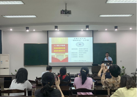 为进一步落实立德树人根本任务,推进课程思政建设,发挥示范引领作用,6月6日下午,学院开展了“课程思政”公开课教学展示活动。王锴、陈昌龙两位主讲教师分别以课程思政示范课程《财务管理学》和《财务与税收》进行了展示。校督导组专家董武清以及院督导组专家组成员参加了此次活动,院课程思政示范课教师以及部分青年教师进行了观摩学习,公开课由副院长周世军主持。