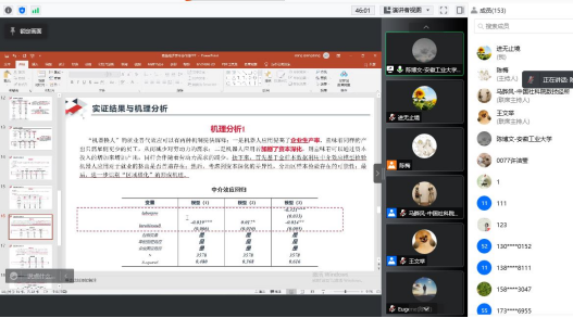 大会从503篇投稿论文中遴选出153篇高质量论文,进入数量经济理论与方法、经济增长、宏观经济运行等12个平行论坛。由我院数量经济学硕士生陈博文和其导师周世军合作的论文《“机器换人”的就业冲击:机理、特征与应对》入选年会论文。陈博文在“数字经济、实验经济学及其他学科”分论坛上进行了汇报,得到了专家学者们的充分肯定。