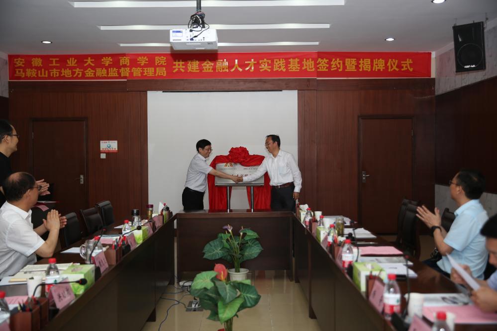6月1日上午,商学院与马鞍山市地方金融监督管理局共建金融人才实践基地签约暨揭牌仪式在安徽工业大学学术会议中心第四会议室举行。马鞍山市政府副市长郑琇煦,马鞍山市地方金融监督管理局党组书记、局长张邦彦,市政府办公室副主任杨奇,马鞍山市地方金融监督管理局党组成员、副局长王超,安徽工业大学校长魏先文,校党委常委、副校长刘明,商学院党委书记洪功翔,商学院院长刘家树,商学院副院长张虎、周世军,以及相关师生代表参加本次活动。