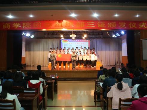 大会伊始,随着主持人的口号响起,全场观众肃然起立,行注目礼迎接团旗。随后,与会团员代表有序坐下,全体团员开始合唱团歌。接着,新团员在领誓人孙晓慧同学带领下进行庄重的入团宣誓仪式,激扬着新生团员的热情与使命感。在全场目送团旗离开后,开始大会的第三项议程,辅导员沈泽俊和刘在春为新生团员代表颁发了三证即团员证、团章和团徽。颁证结束后,由2018级新生团员代表张建航同学发言,他在发言中表达了对于自己加入共青团的骄傲,并表达了身为大学新生团员将努力提升自我,散发新生团员的光彩。随后,2017级老生团员代表耿慧敏上台发言,作为学姐,她讲述了身为一个共青团员应该具有的使命感与责任感,希望新一届的共青团员们能够牢记自己的身份,严格要求自己。接下来,沈泽俊老师上台发言,表达了了对商学院2018级共青团员的期待与美好祝愿,身为学生要起到榜样作用,为班级、为学校、为社会做出贡献;身为祖国的希望与未来要勇敢创新破除陈规,要坚守自己的理想努力拼搏,践行自己的入团誓言,真正实现少年强则国强。会议最后,通过一段视频展示了共青团辉煌灿烂、曲折蜿蜒的风雨历程。