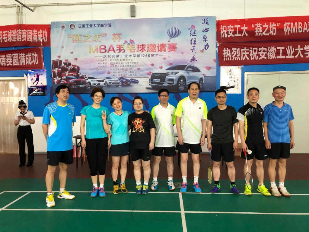 为迎接安徽工业大学60周年校庆,传承文化底蕴,弘扬优良传统,展示办学成就,扩大社会影响,MBA教育中心以羽毛球邀请赛为载体,凝聚校友力量,丰富师生业余生活,促进MBA学员和学员单位之间广泛交流,现由MBA教育中心主办,MBA校友会&MBA联合会共同承办“凝心聚力继往开来”“燕之坊”杯MBA羽毛球邀请赛,比赛于2018年6月24日在奥体爱玛会羽毛球馆(安工大东校区)举行,应邀参加本次比赛的十支队伍分别是安徽MBA代表队,安工大教工代表队,商学院教工代表队,奇瑞集团代表队,马钢代表队,马钢销售公司代表队,马职院代表队,市银行业协会代表队,市直机关代表队,康泰公司代表队。