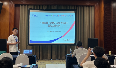 商学院研究生黄河,在管理决策与支持系统分会场,进行了《不确定性下房地产住宅项目投资决策分析》论文汇报,围绕在货币时间价值理论以及投资组合理论的基础之上,基于房地产开发项目资金流动的现实情况,构建住宅项目投资决策的模型。进而,以累积现金流最大化为目标,资金持续循环为约束条件,构建了单目标非线性混合整数模型,并将销售收入波动作为风险指标引入模型,为房企优化项目投资决策提供决策参考。在场的参会专家及学者进行了点评,并提出了修改建议。