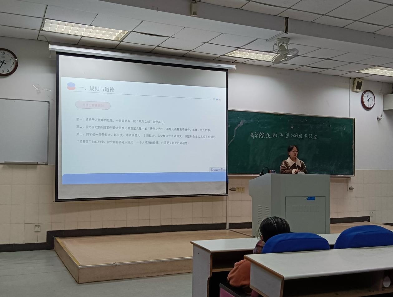 为强化新生诚信自律,增强同学们的规则意识,12月6日,商学院在东阶102教室召开“遵规守纪,诚信做人”主题年级会。会议由辅导员老师钱龙梁、肖梦雨、张舒主讲,大一全体新生参与。