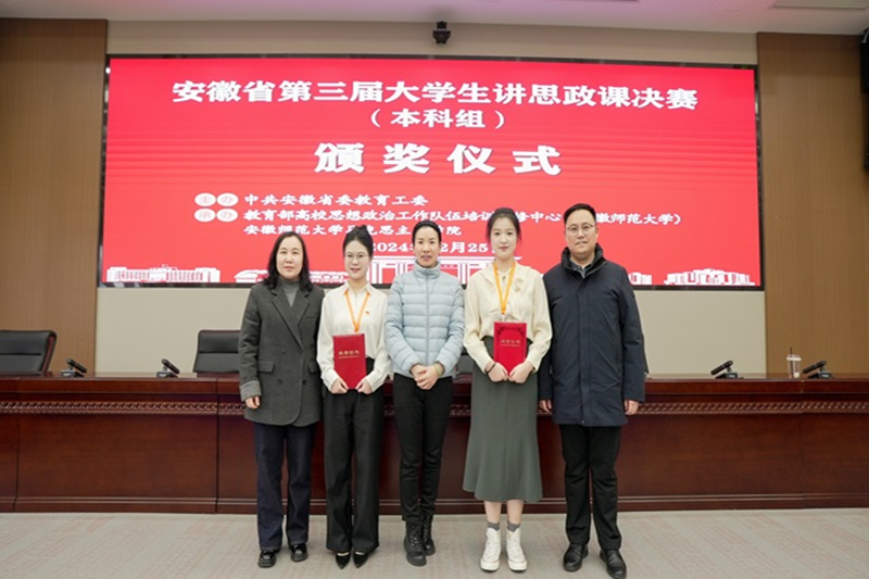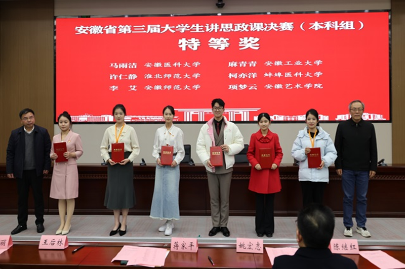 12月25日,由中共安徽省委教育工委主办的“七十五载薪火传承,千秋伟业奋斗有我”安徽省第三届大学生讲思政课本科组决赛在安徽师范大学举行。经过激烈的现场角逐,我院《毛泽东思想和中国特色社会主义理论体系》课程组的麻青青(指导老师:陆春晖、苗云飞)荣获特等奖。