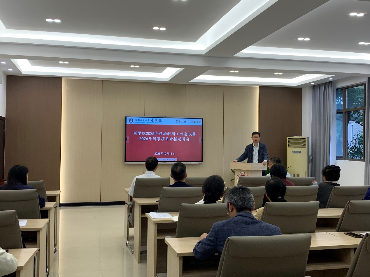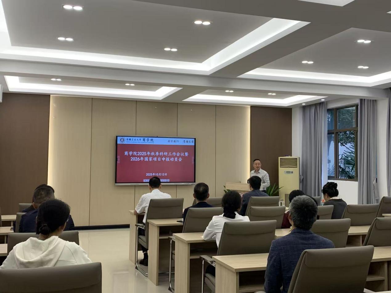 10月13日下午,商学院召开了2025年秋季科研工作会议暨2026年国家项目申报动员会。院长章铁生、副院长周世军,学院全体博士、教授、副教授参加本次会议。会议邀请校科研处处长吴宣够到会指导。会议由周世军主持。