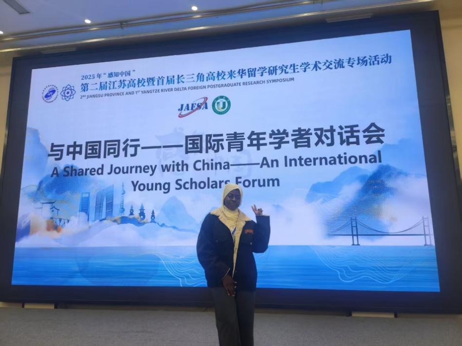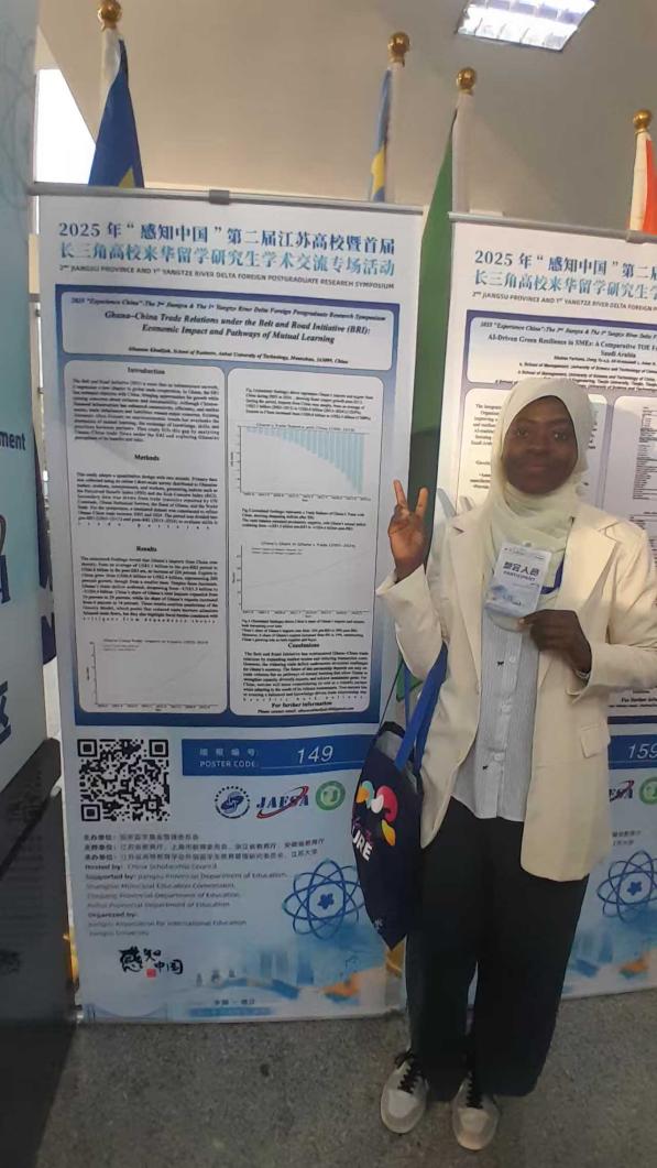 10月24日至26日,2025年“感知中国”第二届江苏高校暨首届长三角高校来华留学研究生学术交流专场活动在江苏大学隆重举办。我院留学生教育中心主任朱婷婷带领国际经济与贸易专业留学生研究生Alhassan Khadijah一行参会,凭借扎实的学术功底和精彩的成果展示,Alhassan Khadijah最终斩获学术论文“优秀奖”。