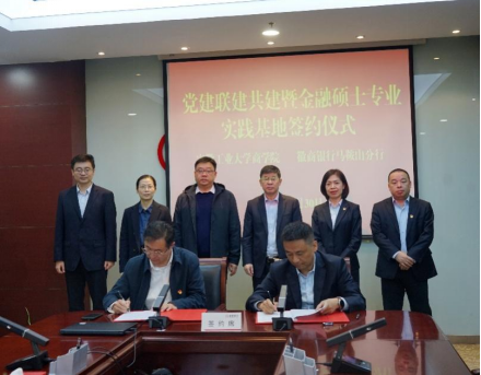 为深化校企合作,10月30日下午,商学院党委书记杜飞,副院长李伟军,金融硕士教育中心主任刘丽萍赴徽商银行马鞍山分行,与徽商银行马鞍山分行相关领导共同举行“商学院党委与徽商银行马鞍山分行党委党建联建共建暨金融硕士专业实践基地签约与挂牌仪式”。