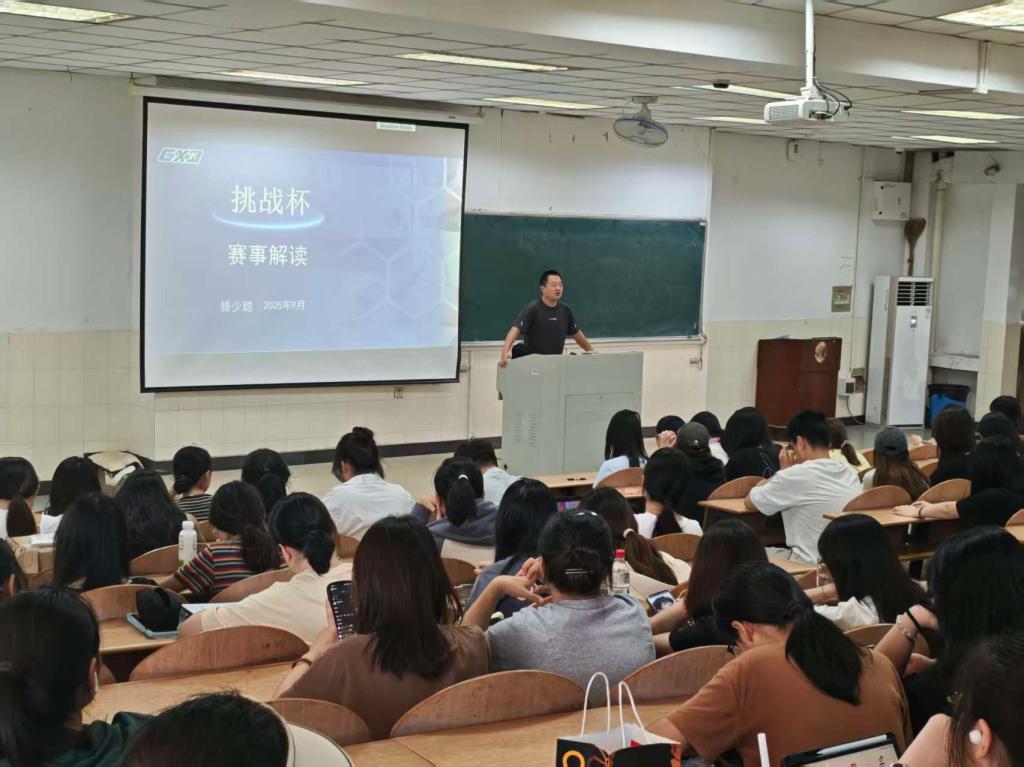 为帮助同学们深入了解“挑战杯”赛事,激发同学们创新创业热情,我院于2025年9月22日,在阶教201举办“挑战杯”宣讲会。本次宣讲会由刘在春老师主持,腾少聪老师主讲,活动顺利举办,共吸引300多名同学参加。