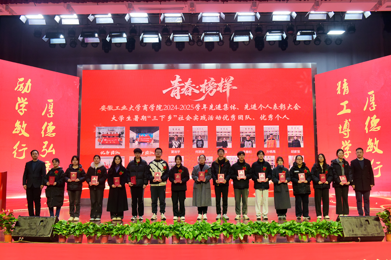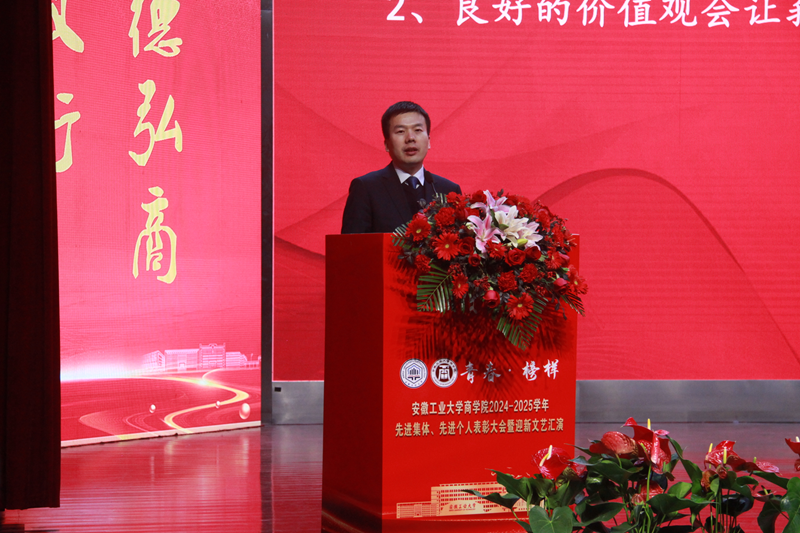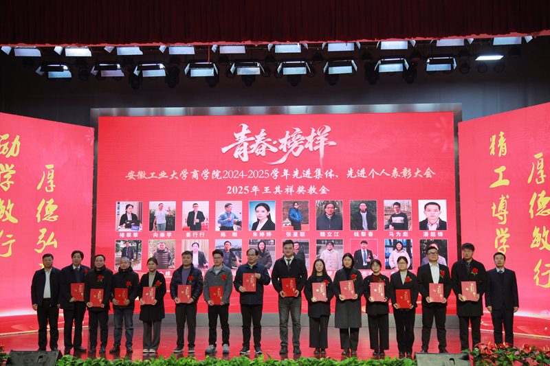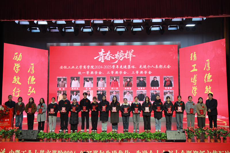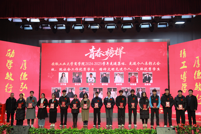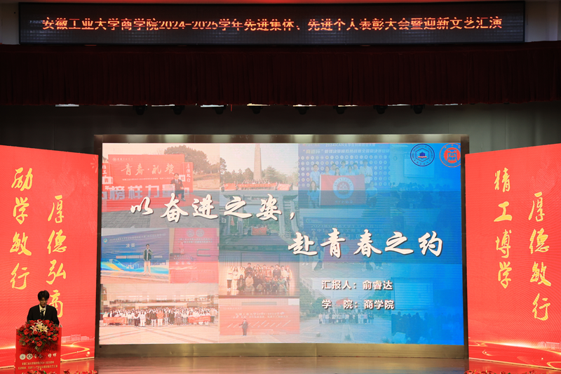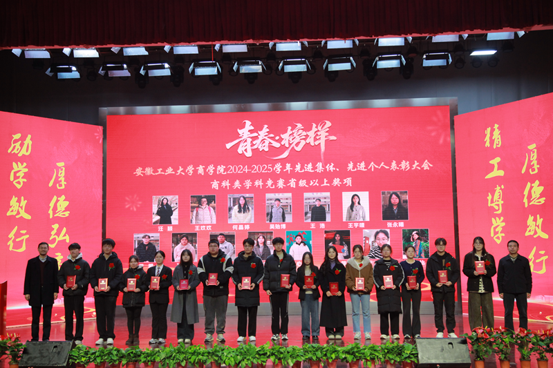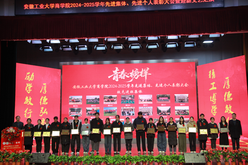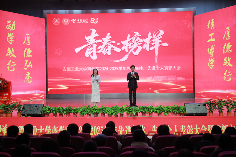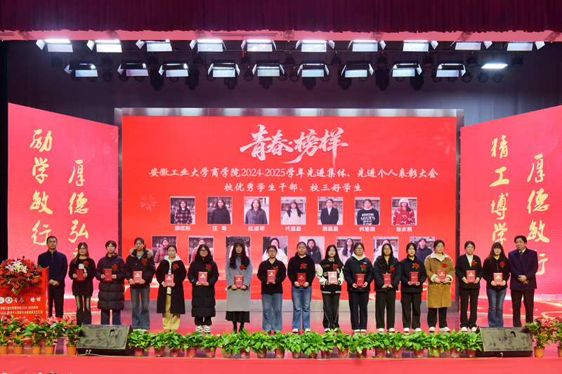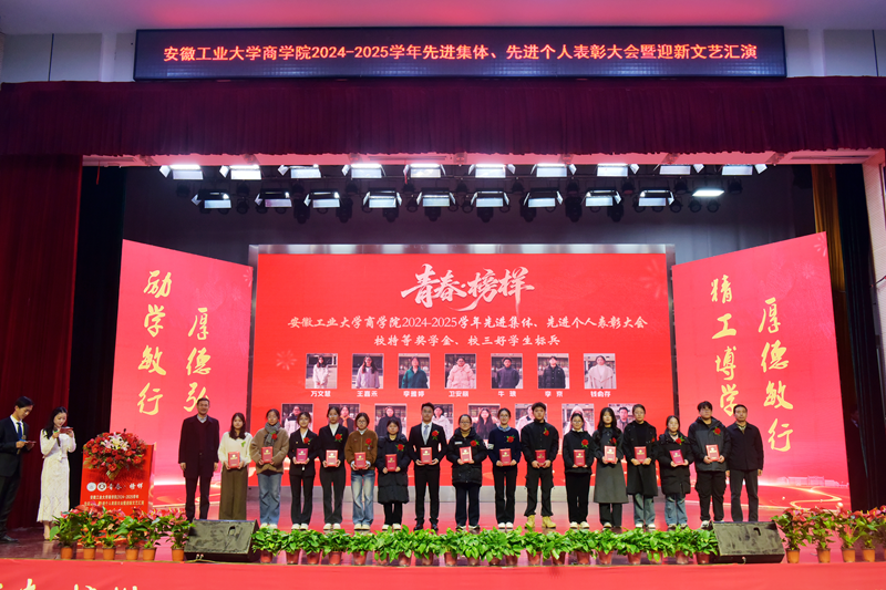 1月5日下午,商学院2024—2025学年“青春·榜样”先进集体、先进个人表彰大会暨迎新文艺汇演在秀山校区大学生活动中心报告厅举行。校党委副书记王俊出席大会并为获奖代表颁奖。中国电信马鞍山分公司总经理张磊,中国电信马鞍山分公司政企部主任胡志文,全体院领导,优秀校友代表,各系室主任(党支部书记),各学位点负责人,受表彰的先进集体、先进个人代表,教师和高年级学生代表,2025级新生参加大会。