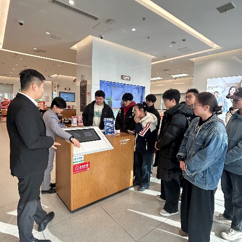 在招商银行马鞍山分行和平安产险马鞍山中心支公司参观学习中,金融机构负责人带领同学们参观了营业网点,重点介绍了智能服务设备。在交流座谈环节,就金融机构近年来数字化转型及数字化如何运用于金融机构的前中后台进行了详细地讲解。