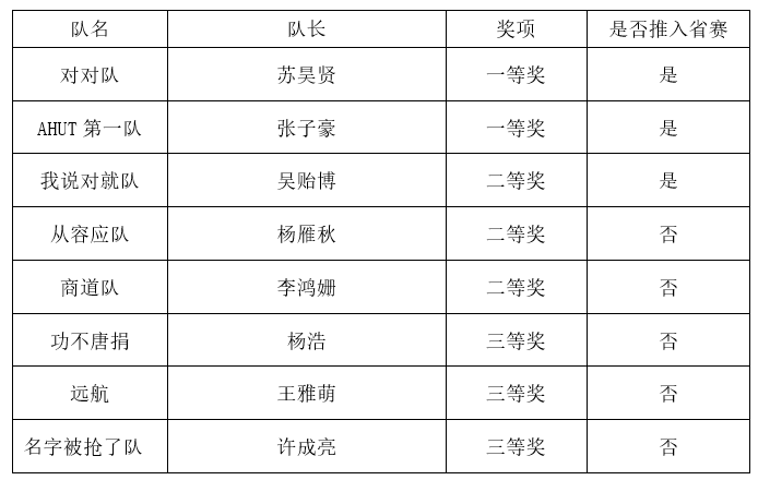 拟推荐以上3支队伍进入省赛:对对队,AHUT第一队,我说对就队。公示期自10月14日起,公示三个工作日,公示期间如有异议,请到商学院反映,联系人:刘老师,联系电话:0555-2315486。
