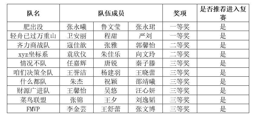 拟推荐以下队伍进入全国复赛:肥出没、轻舟已过万重山、齐力商战队、xyz坐标系队、情况不队、咱们决策全队、什么都队、财源广进队、菜鸟联盟、FMVP。