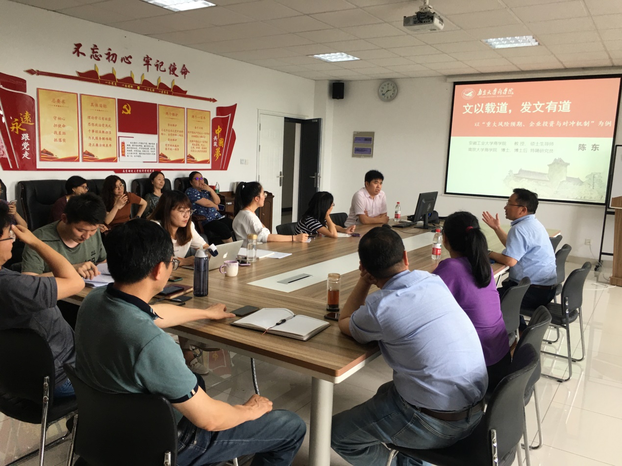 6月2日下午,我院经济系陈东教授应邀做客南京邮电大学经济学院学术讲座,作了“文以载道、发文有道——以‘重大风险预期、企业投资与对冲机制’为例”的主题报告。论坛由南京邮电大学经济学院院长岳中刚教授主持,30余位教师聆听了报告。