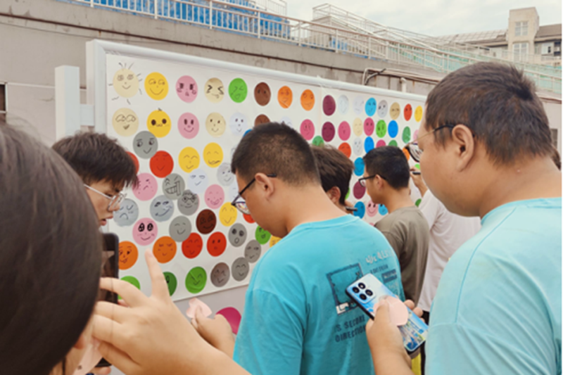 在这次游园会中,“情绪多彩,留下笑脸”这一环节颇受关注。展板前,学生用画笔在预留的位置上描绘着自己的情绪。每一幅画作都是一个独特的心灵故事,它们汇聚在一起构成丰富多彩的情绪画卷。学生通过这种方式将自己的情绪外化,将内心的感受传递给他人。这个环节不仅增进了学生间的情感交流,也为大家提供了一个反思自我、理解他人的机会。
