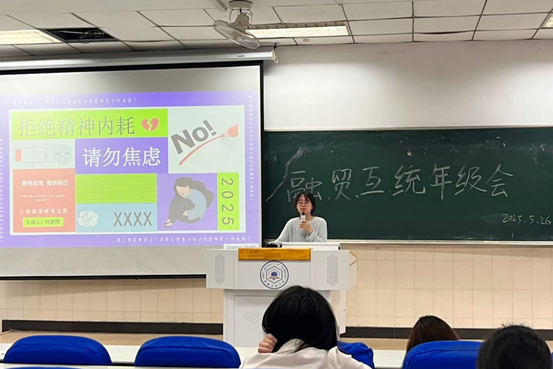 为落实习近平总书记关于青少年心理健康教育的重要指示,培养学生积极心理品质,5月26日,商学院在东校区阶梯教室102举办 “破内耗阴霾,筑心灵绿洲” 主题年级会。此次会议由辅导员肖梦雨主讲,2023级全体同学参加。