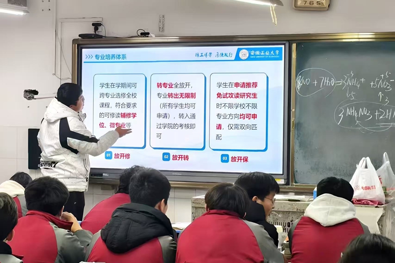 随后,团队成员就安徽工业大学的招生政策进行了详细解读,重点介绍了专业设置、志愿填报等方面的内容,并对同学们提出的疑问逐一做出解答。最后,刘杰结合自身学习经历,分享了备考经验和学习方法,帮助同学们合理规划学习目标,增强备考信心。
