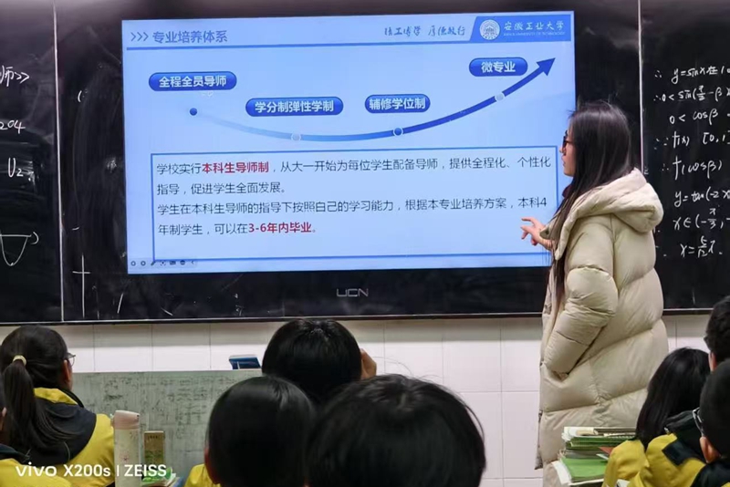 宣讲尾声,宣讲人结合自身成长经历,分享实用的学习经验与多彩的大学生活感悟,鼓励高三学子坚定目标、全力冲刺高考,诚挚期待来年与大家在安工大相遇。