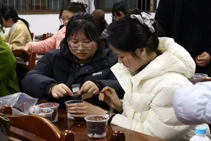 伴随着欢声笑语,迎来了本次活动的核心环节——现场种植体验。同学们两人一组,在工作人员的引导下有序完成领养协议签署、种植物资领取与绿植品种挑选。大家结合所学习的科普知识分工协作,装土、播种、装饰,每一个步骤都细致用心。一株株多肉与花种在同学们的巧手中完成栽植,成为独属于自己的绿色风景。
